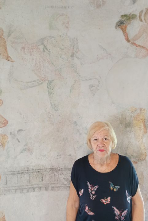 Bolzano, 7 agosto 2020 - Anna accanto ad affreschi cinquecenteschi (sbiaditi) dell'Aritmetica e della Geometria