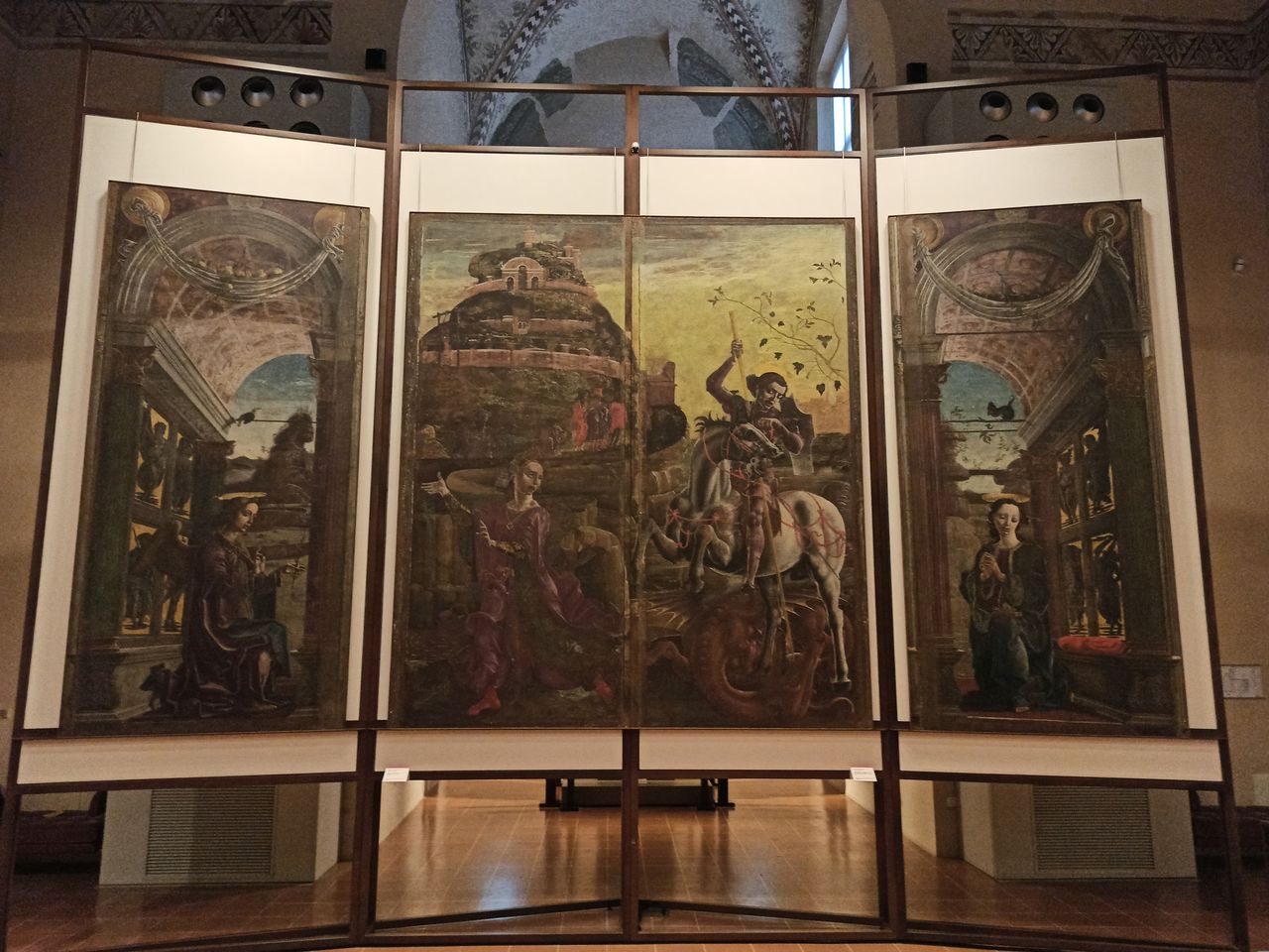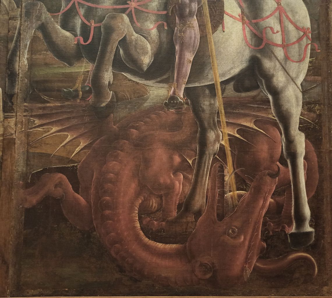 Cosmè Tura dà il giusto rilievo alla partecipazione del cavallo, tant'è che il dipinto dovrebbe essere denominato: "San Giorgio a cavallo, il drago e la principessa". Ovviamente qui abbiamo anche l'Annuciazione, ma è indipendente dal San Giorgio.