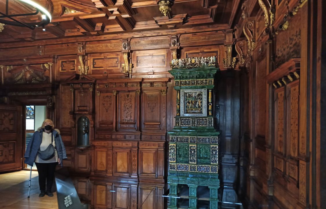 Sala zurighese cinquecentesca con stufa in maiolica ottocentesca